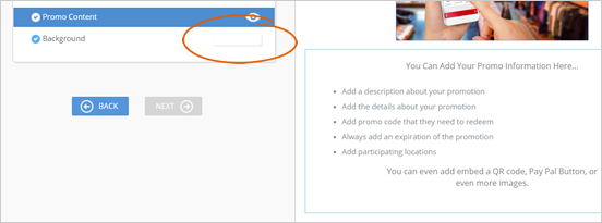 Step 12. If you need to change the background color, click the background, and select a color from the color picker. If you are satisfied with the design of your Promo Page, click Next.