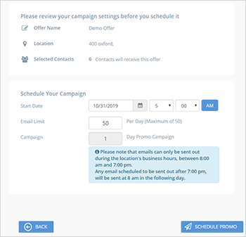 Step 14. Review your campaign's details and schedule it on when it will go out. Remember that you can send up to 50 Promo Emails daily for this particular campaign, and if you want to generate this campaign already, click the Schedule Promo button.
