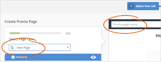 Step 8. You can use your existing Promo Page if you have one, but since we want to create a new Promo Page, select the New Page option from the drop-down list and type the name of this new Promo Page.