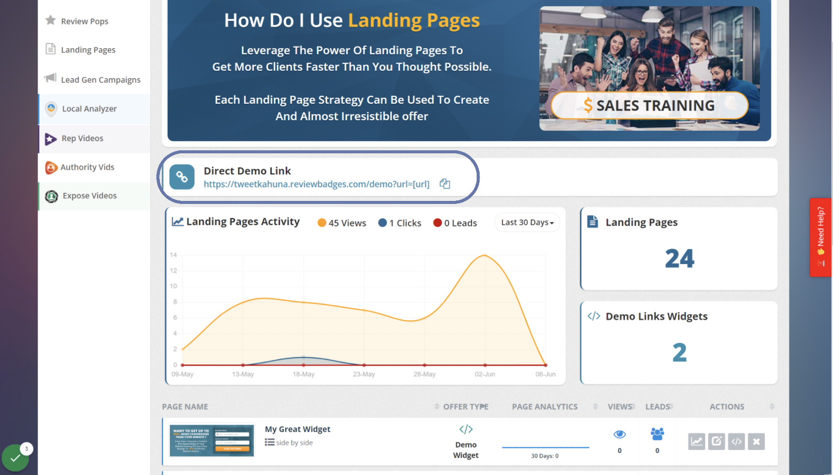 The Direct Demo Link provides you the ability to generate a preview of what a prospect's website will look like with the Review Pop Demo on it. Using the Direct Demo Link allows you to bypass the step of your prospect inputting their info into your Demo Widget. You create the link and can share it directly with your prospect.