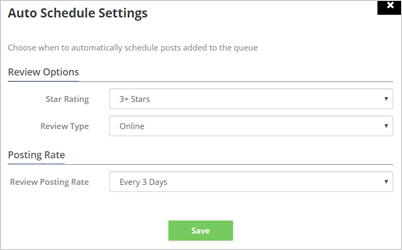 You can update the automatic scheduling of posts as they are added to the queue at any time. You can choose the Star Rating, Review Type (online or feedback), and then the Frequency of Posts.
