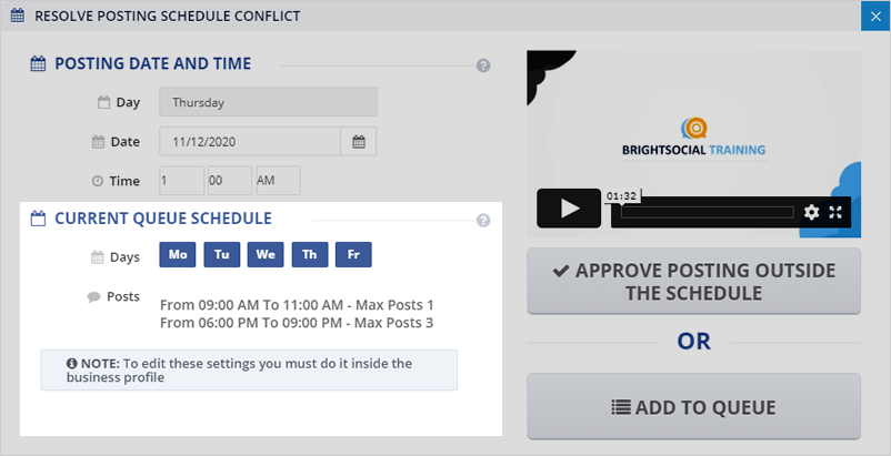 If you are comfortable with your time selection, click the Approve Posting Outside the Schedule button.