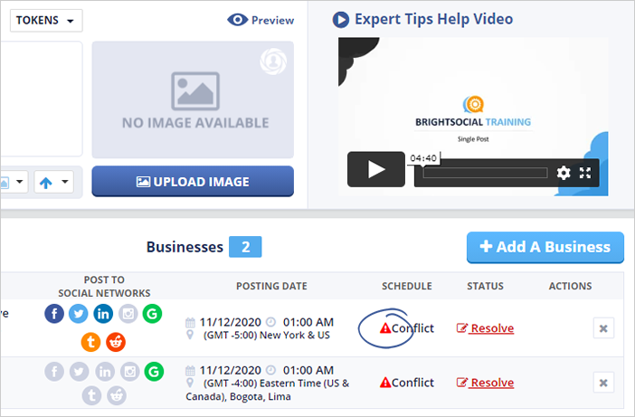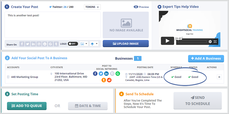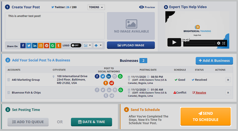 When scheduling a one-off post for a business you manage, consider using the Single Post feature inside BrightSocial. You can schedule a Single Post for one business, multiple businesses, or a pre-created Group of businesses that you manage.