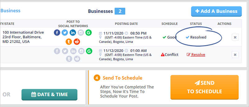If the Time and Date you selected is within the Autoschedule options you had set up at the time of creating the business, then you will be able to easily continue by clicking the Send to Schedule button.