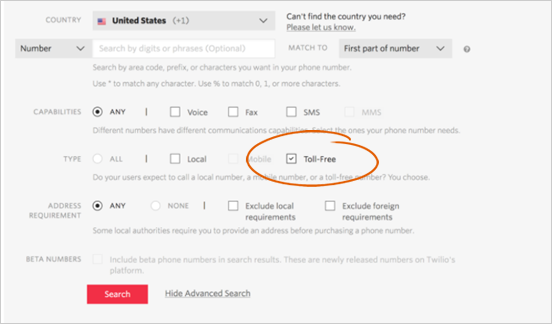 Step 3. Search for and Purchase a TOLL-FREE phone number instead of a local number ( starting with (833), (844), or (866), for example.