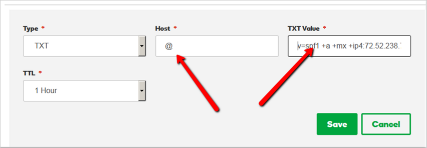 For a TXT SPF record, enter the SPF rule in the TXT Value field: