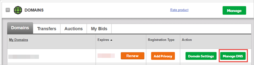 Step 3. Next to the domain you want to manage, under the Action section, click on the Manage DNS button.