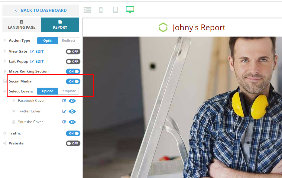 9. If you are enabling Social Engagment or Social Covers in your report, choose if you want to use your social cover or use our existing templates. You also have the option to hide or show the Social Covers for Facebook, Twitter, and YouTube.