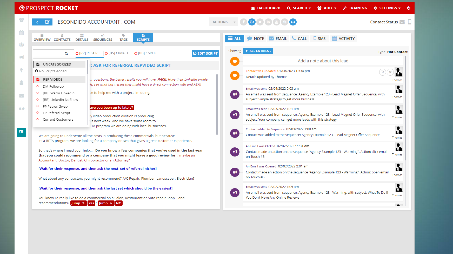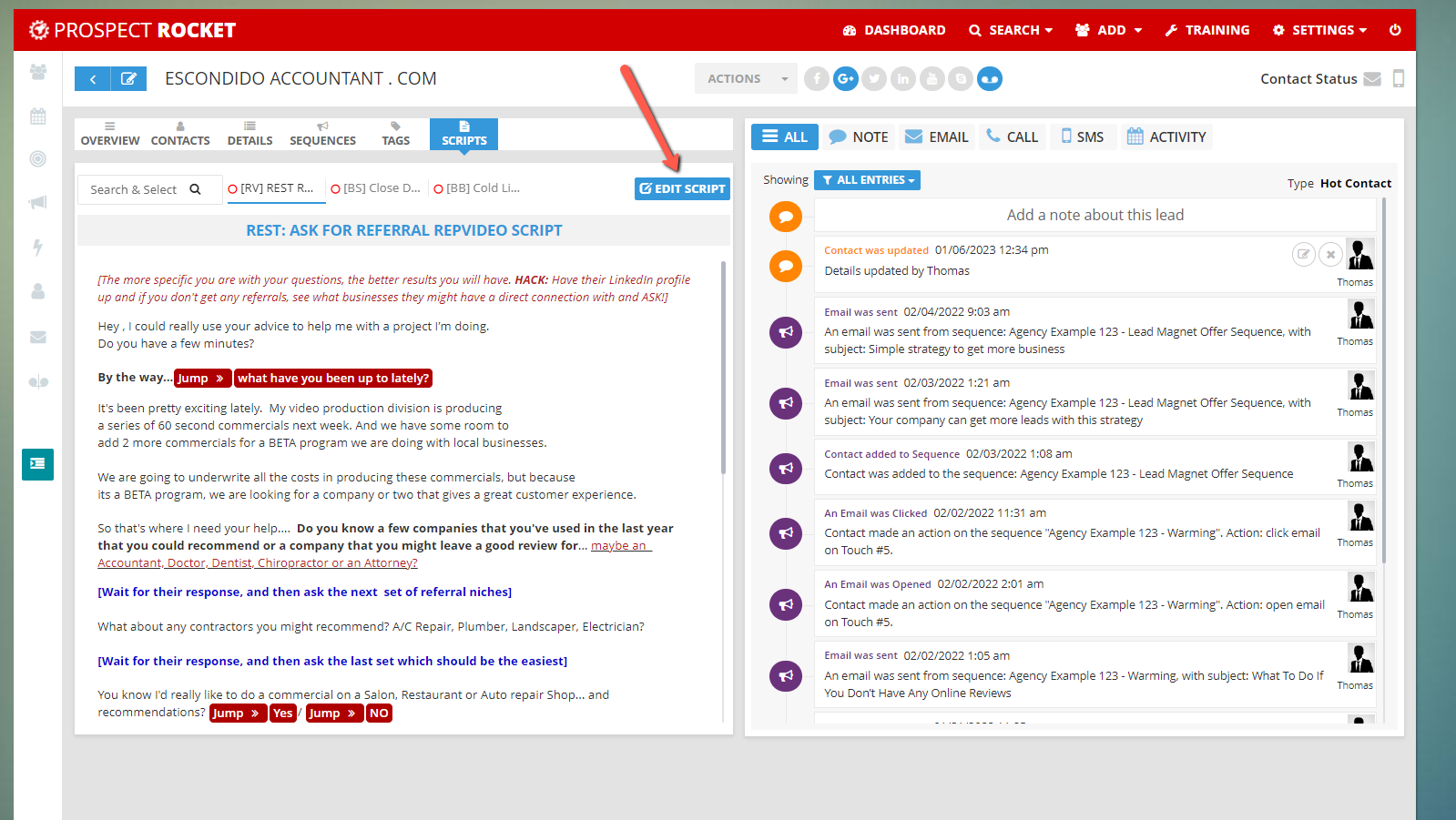 To organize your scripts, click on the "Edit Script" button . This will lead you to the Edit Area which lets you edit your scripts for every single contacts record in all of Prospect Rocket. So even though you are on that specific contact record, it will update all the scripts for all the Contact Records.