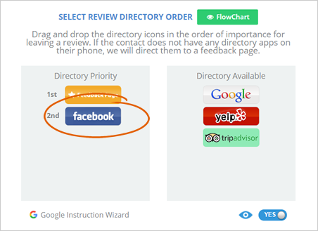 Step 9. As an example, Facebook is set to be the second Directory Priority. This means, after your customer went on your Landing page and then clicked “Yes,” acknowledging they want to leave a review, they will be sent to a Facebook site where they can leave their review.