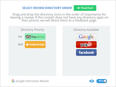 Step 8. To further explain how this works, you can click the Flowchart button. As you can see, we send an SMS Text to the customer with a Landing Page. Now, if the customer clicks “Yes,” they will be choosing the directory, they want to leave their review. One they chose a directory, they will be redirected to that actual site.