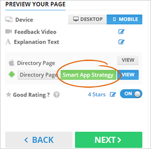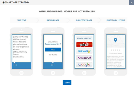 A Smart App Strategy will allow you to send a text message with a mobile landing page link to the customer. The mobile landing page asks the customer, “Would You Recommend Us?” The customer can choose “Yes” or “No Thanks.” If the customer clicks “No,” we direct them to the locations default page. If the customer clicks “Yes,” we will send them directly to a mobile directory page that you choose.